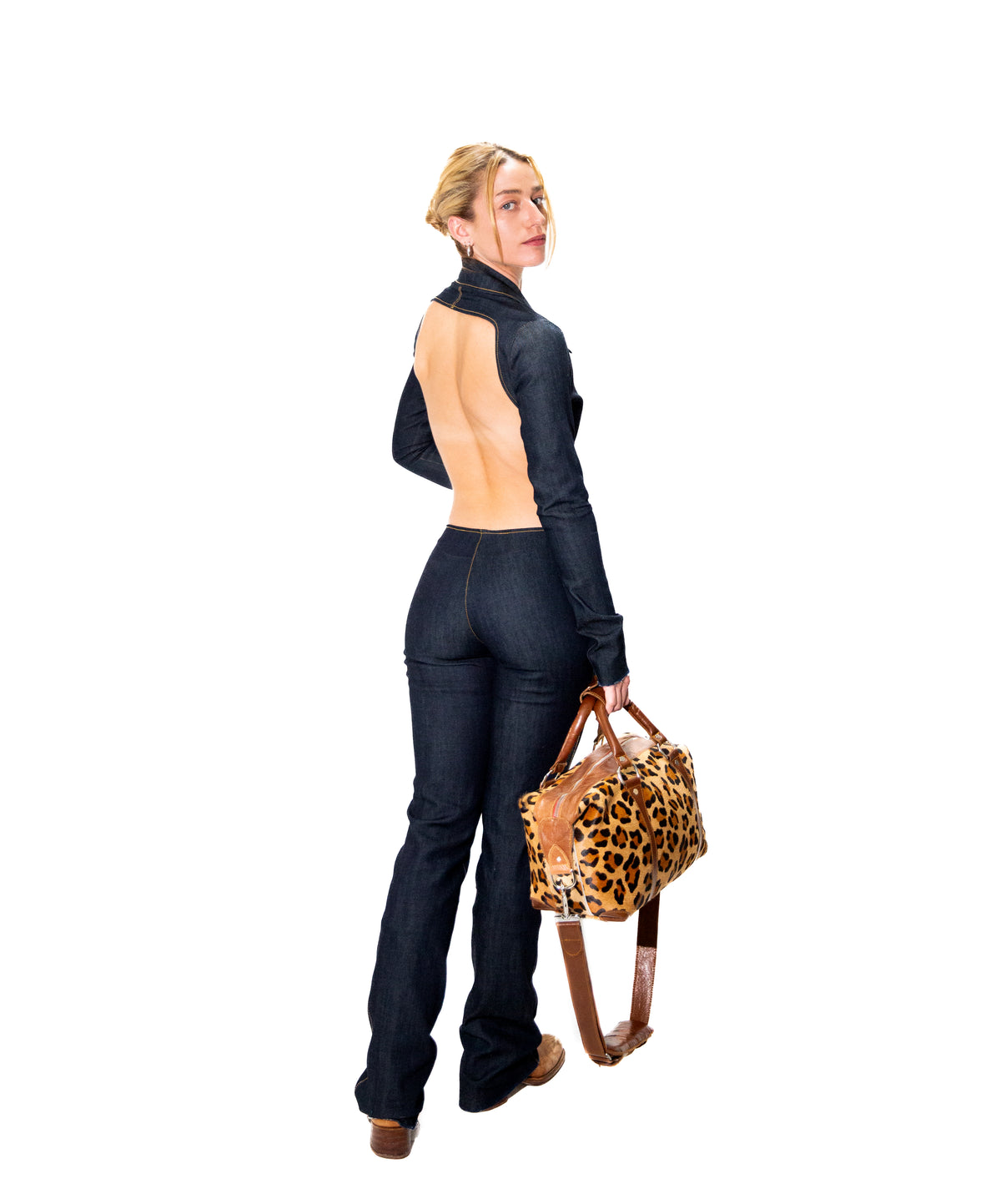 A large duffle bag crafted from luxurious Italian HAIR ON calf leather, in a striking tan and tobacco leopard print. Features tobacco Leather accent straps, silver hardware, and an adjustable shoulder strap.