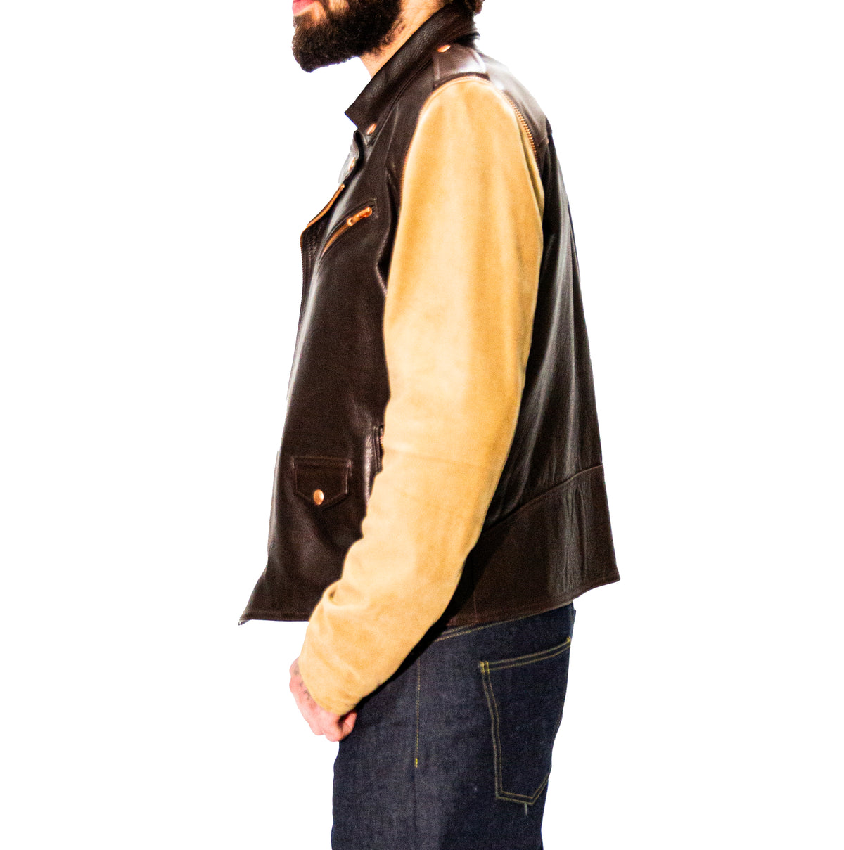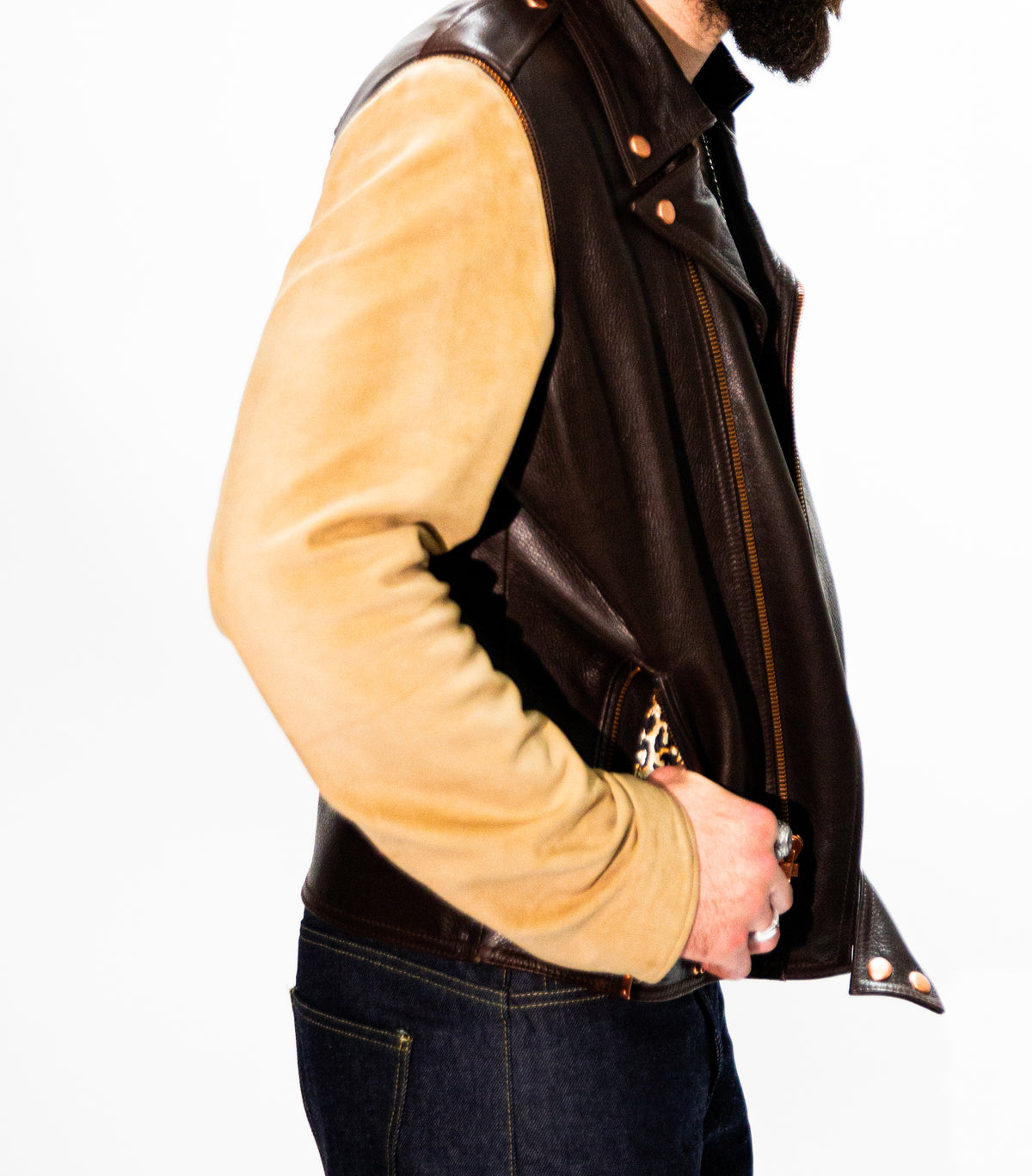 Brown Leather / Suede combo Jacket , features zip off sleeves, rose gold primium zippers, and snaps, Leopard Linning