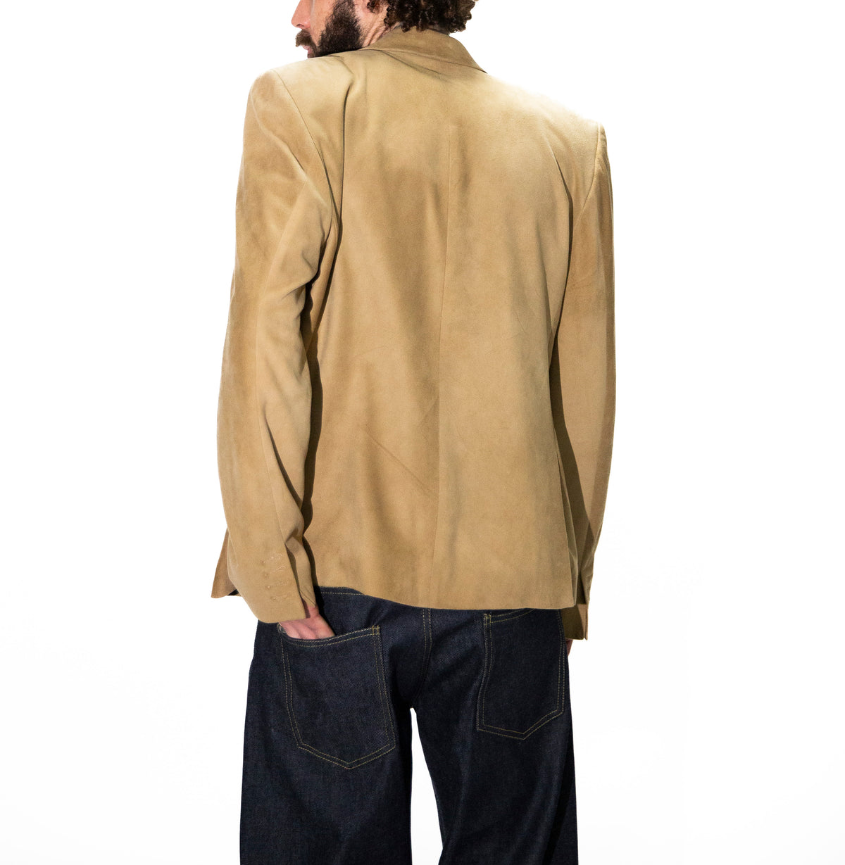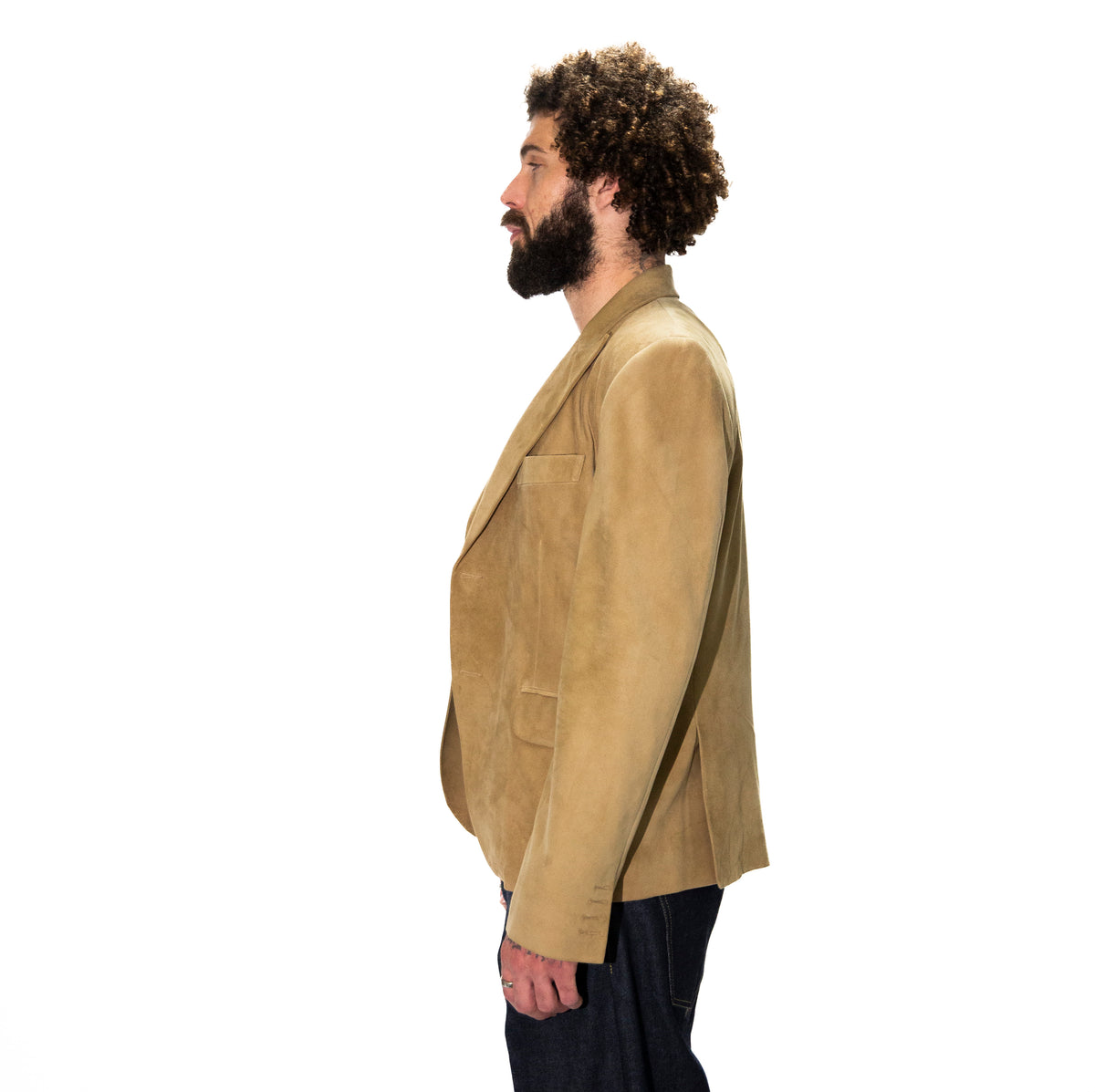 A soft Italian Goat Suede Blazer in a refined tan hue, featuring a buttonless notched lapel for a clean, minimalist look.