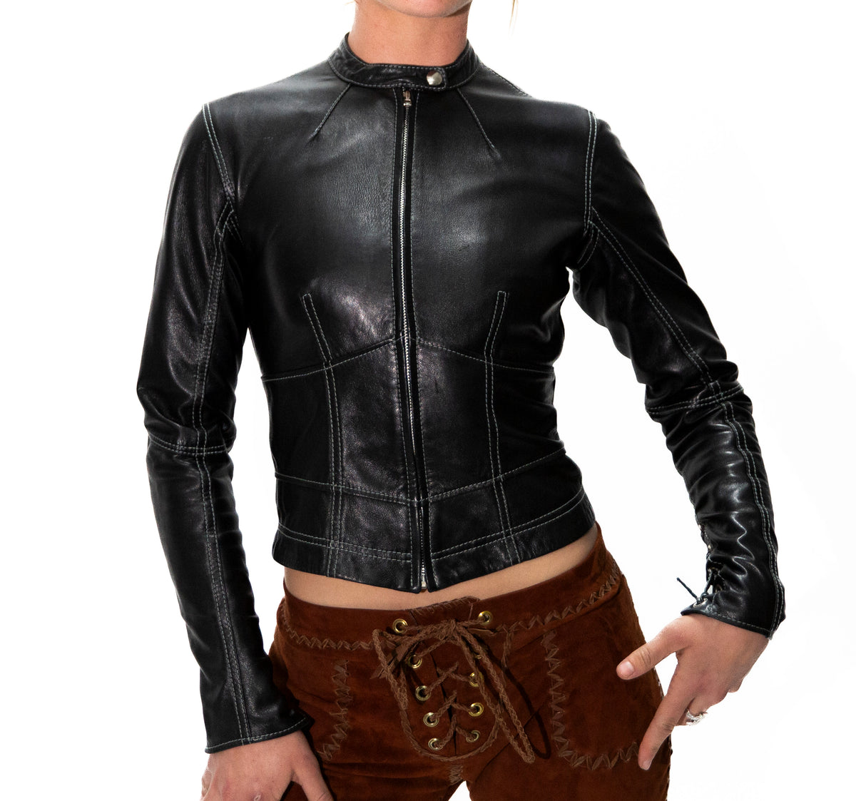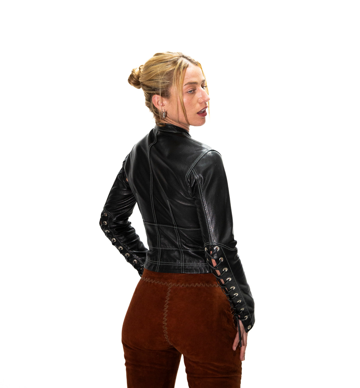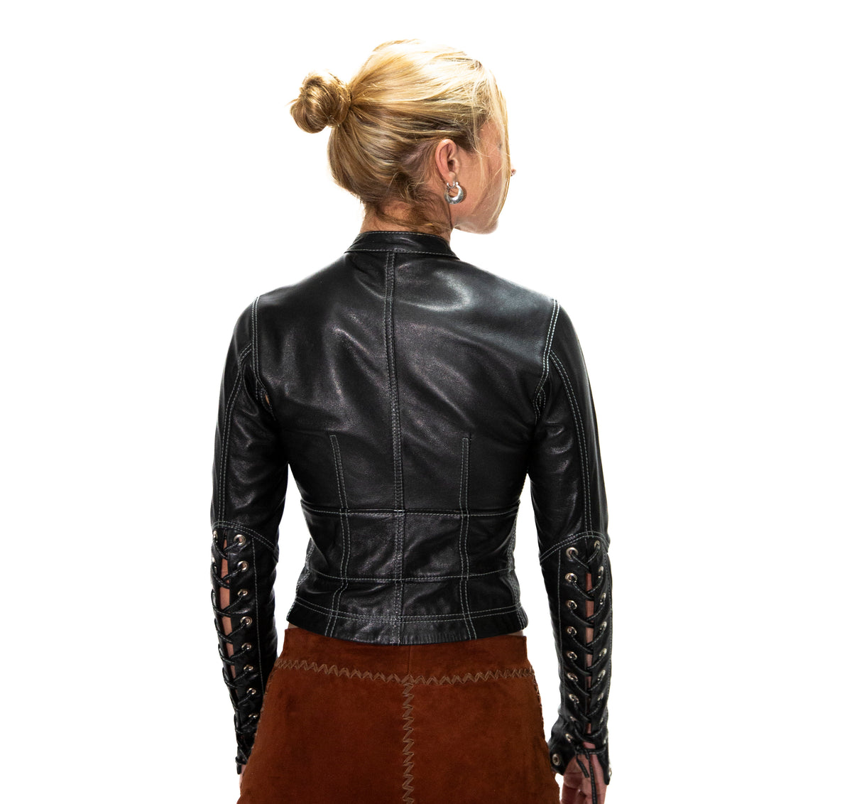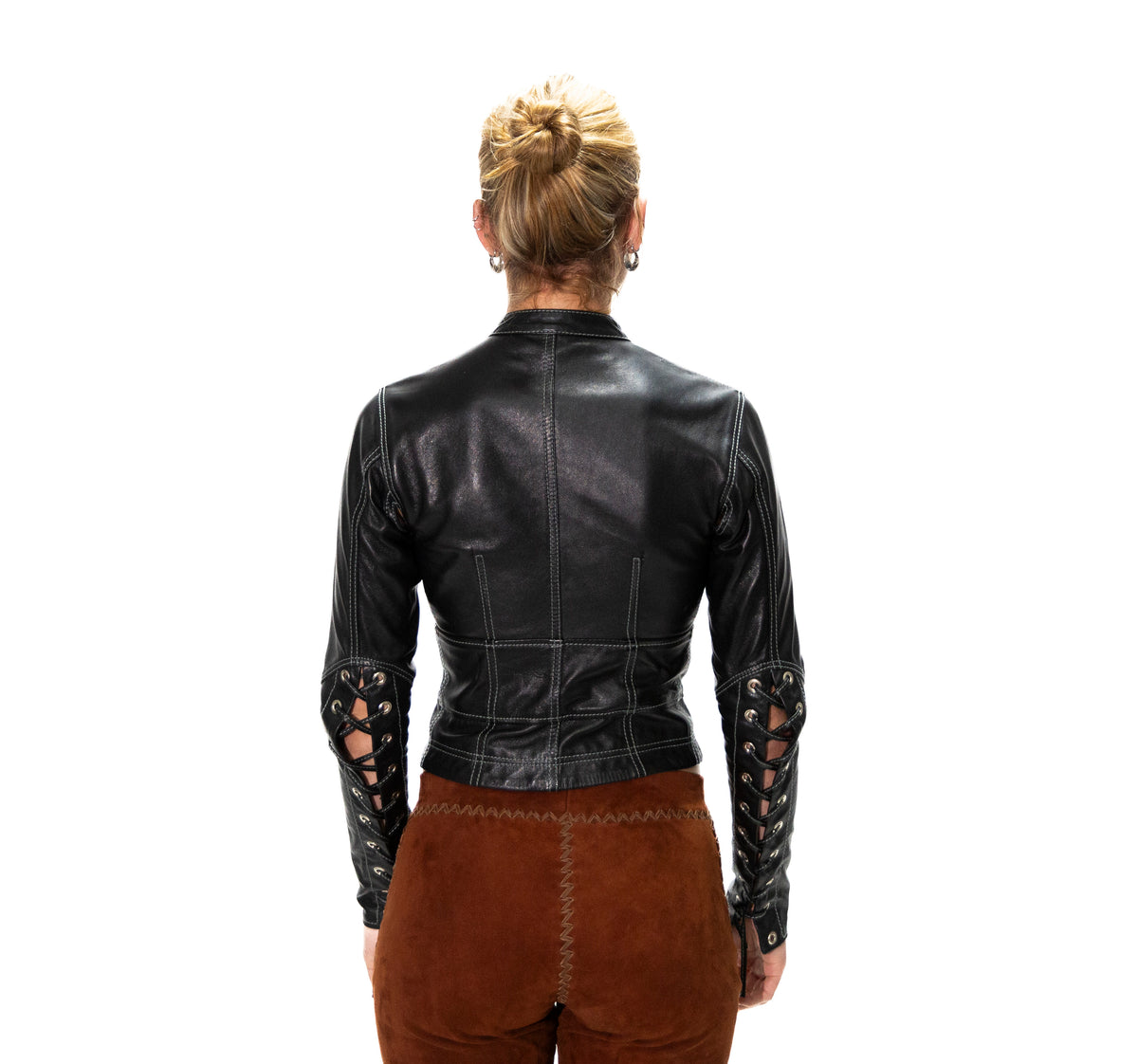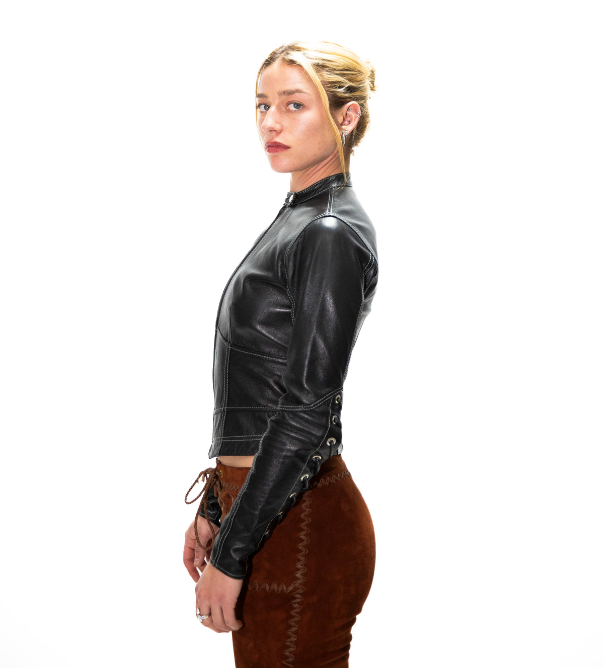 A sleek, form-fitting corset-style moto jacket crafted from soft black Italian lamb leather. Features contrast stitching, lace-up sleeves, and vents in the sleeves armsyes.