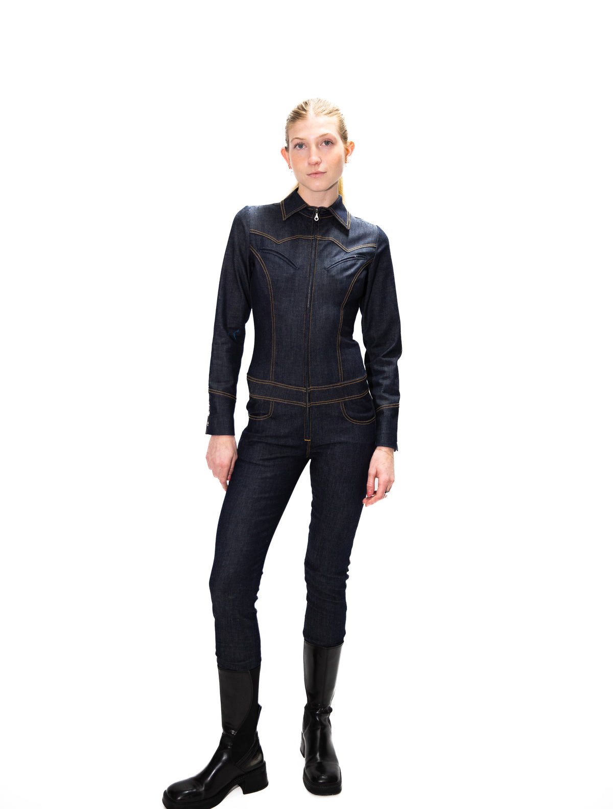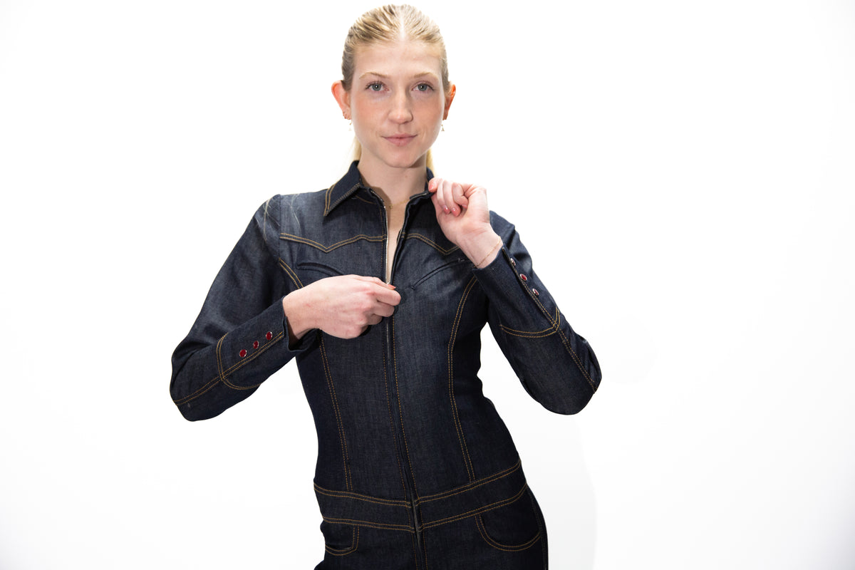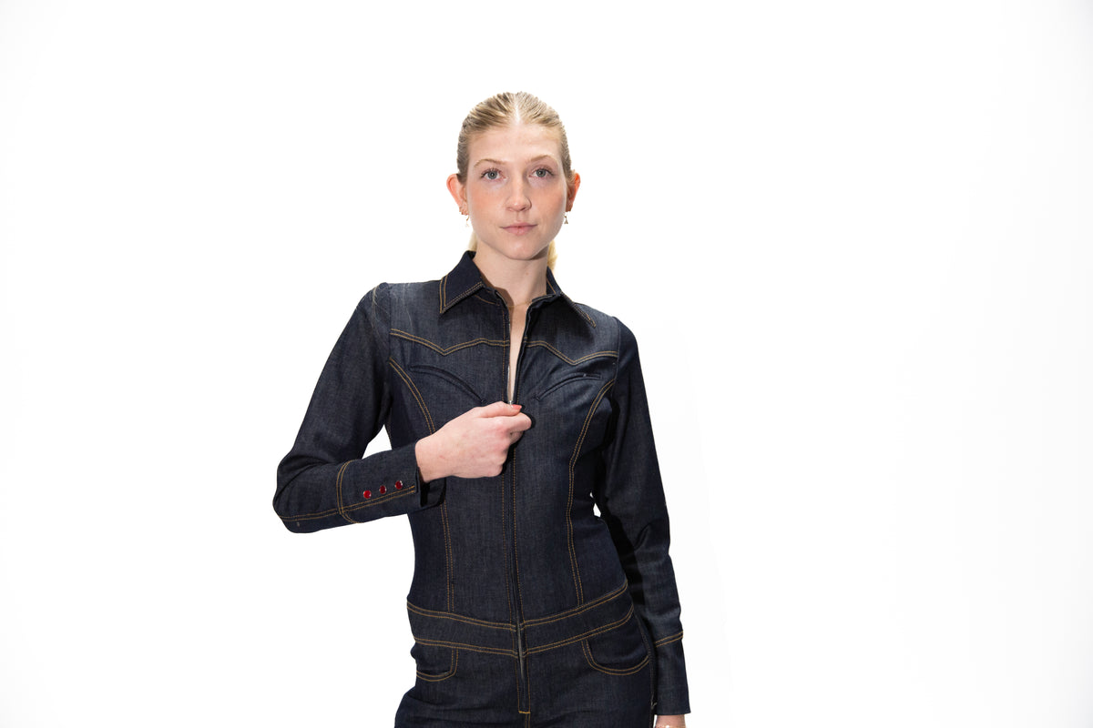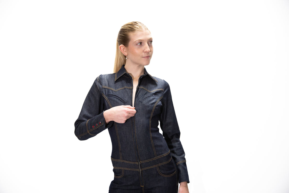 This tailored INDIGO BLUE STRETCH DENIM catsuit redefines sleekness, featuring a structured shirt collar, western yokes, top pockets, a high-hip belt, and a skinny-leg silhouette, ANTIQUE GOLD TOP STITCH.