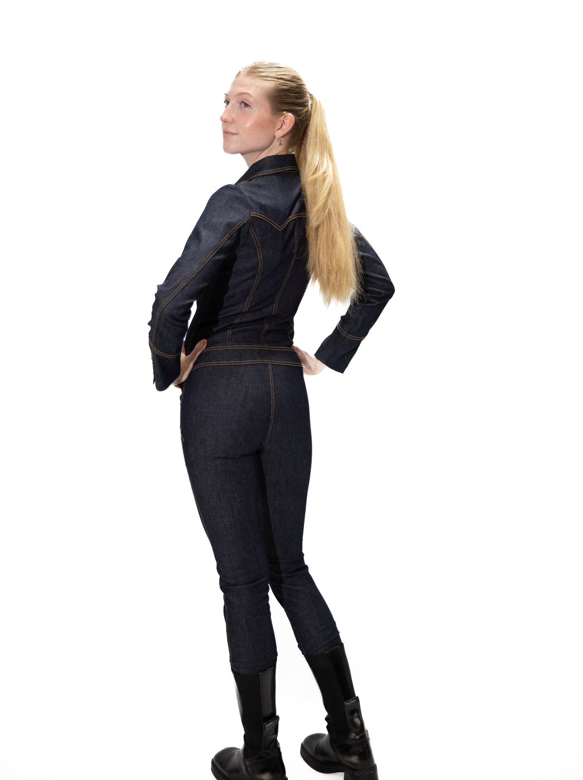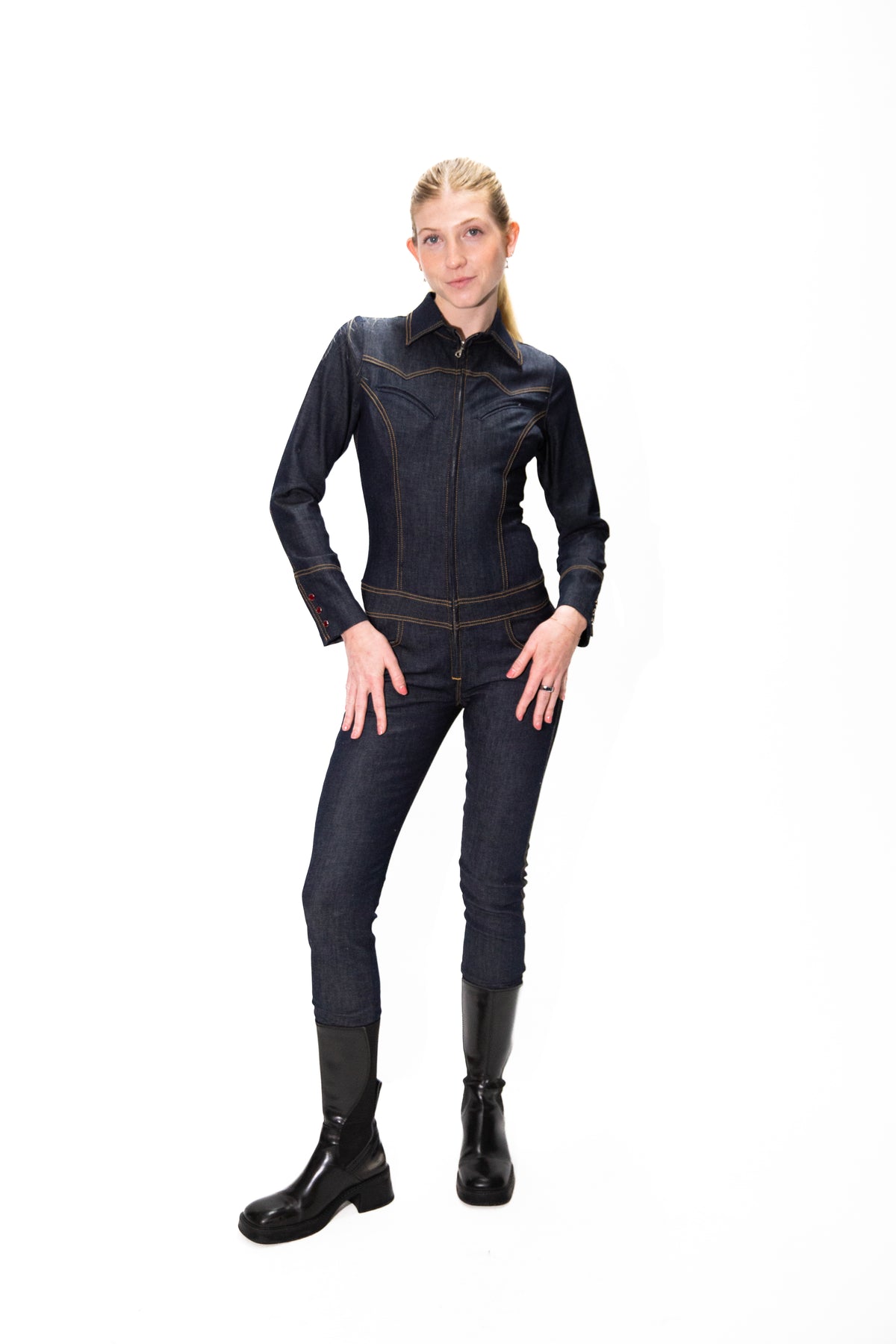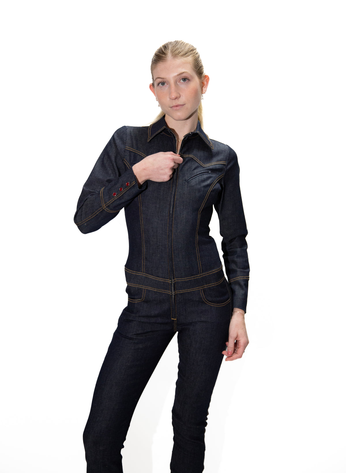 This tailored INDIGO BLUE STRETCH DENIM catsuit redefines sleekness, featuring a structured shirt collar, western yokes, top pockets, a high-hip belt, and a skinny-leg silhouette, ANTIQUE GOLD TOP STITCH.