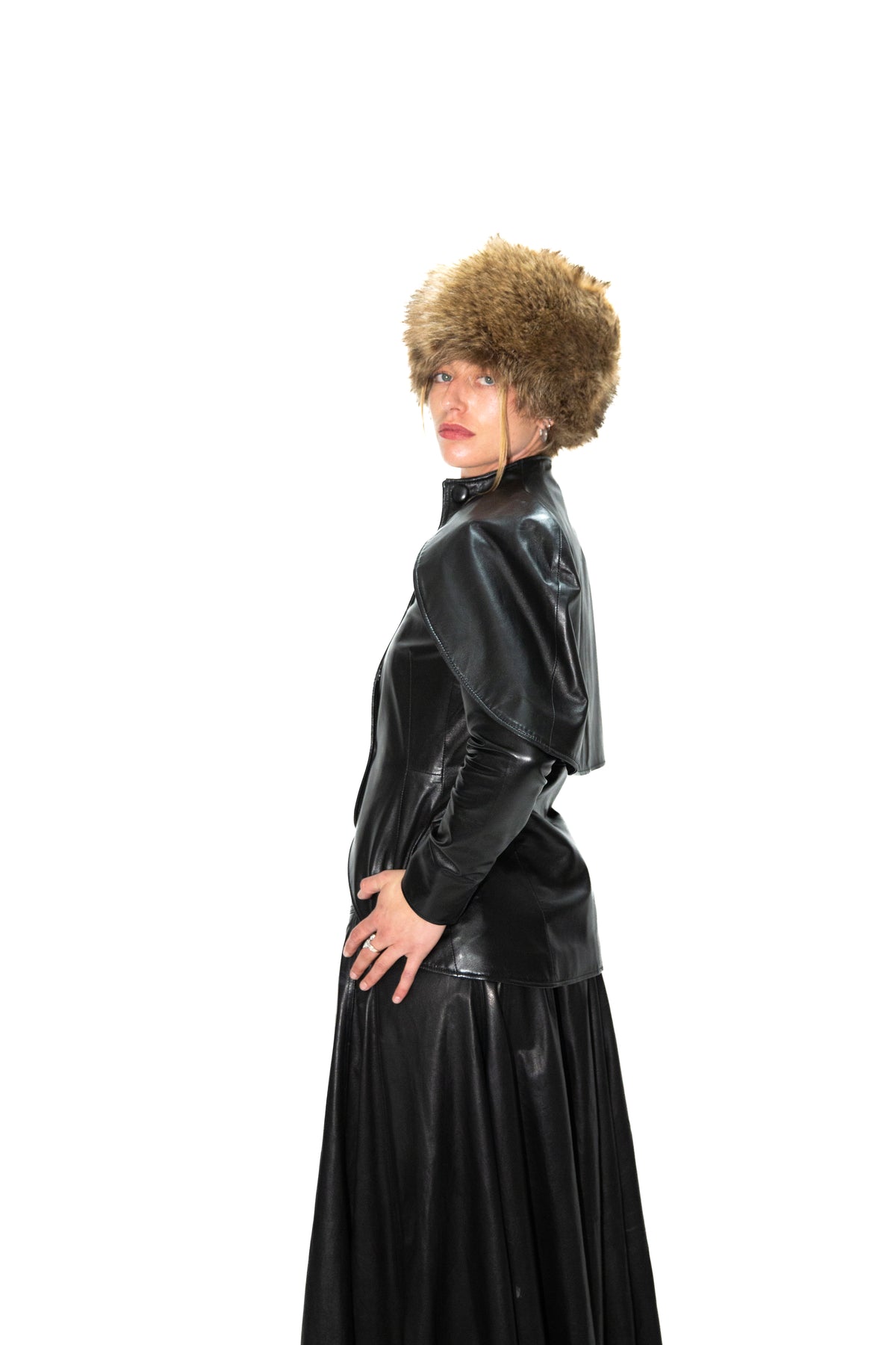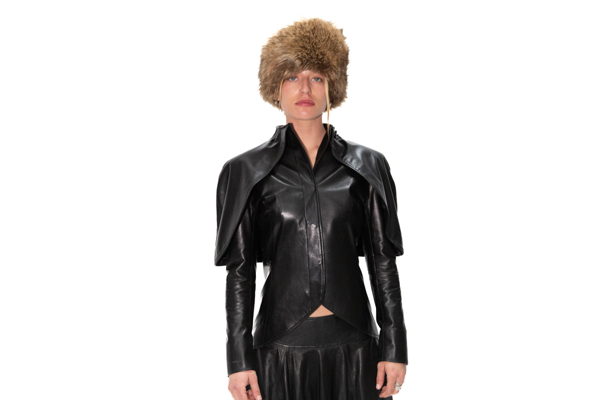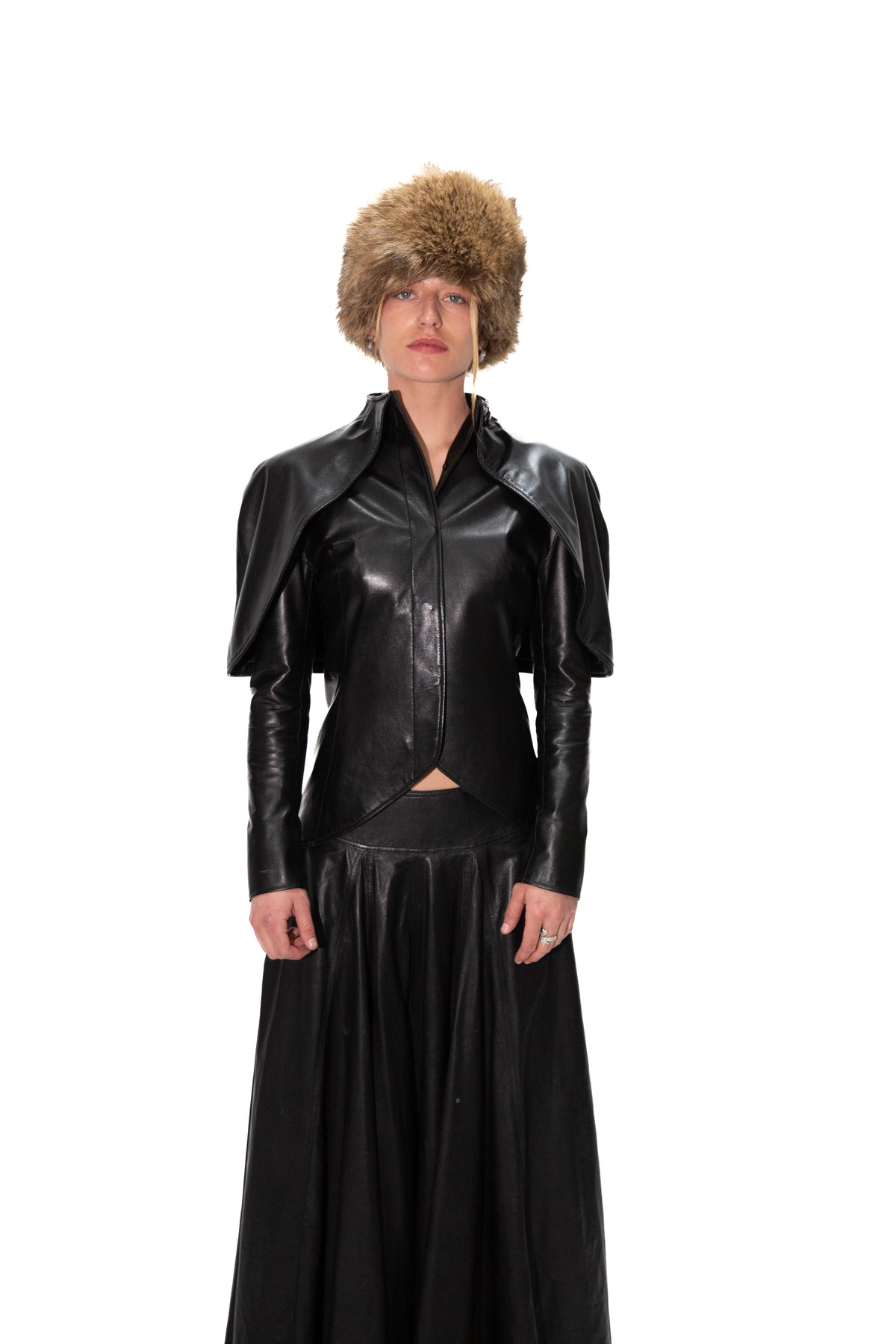 A statement piece featuring a caped shoulder silhouette, Mandarin collar, button front closure, and hidden buttons leading to the neck.