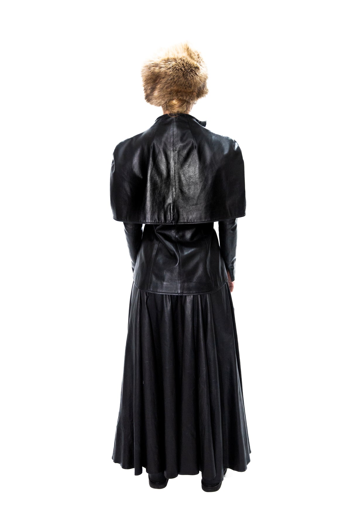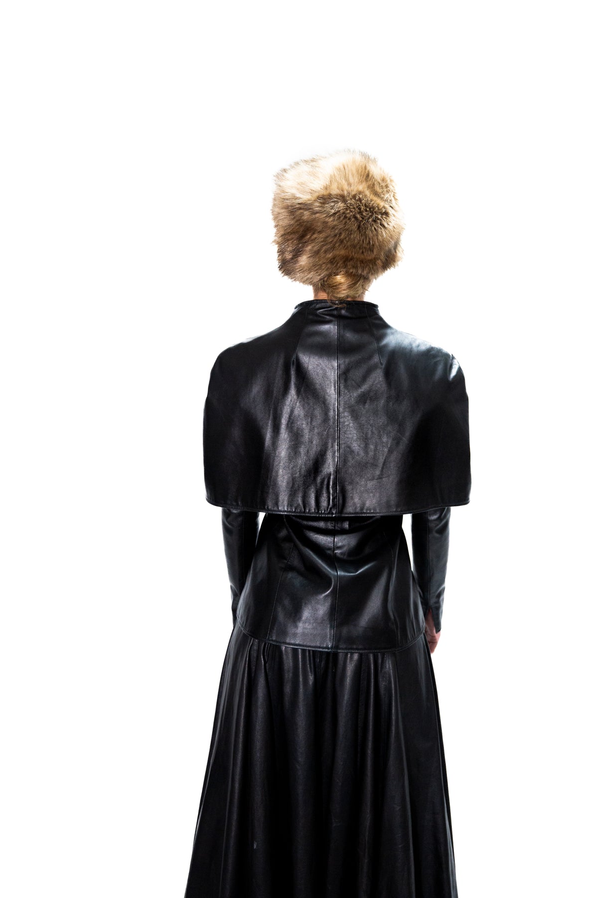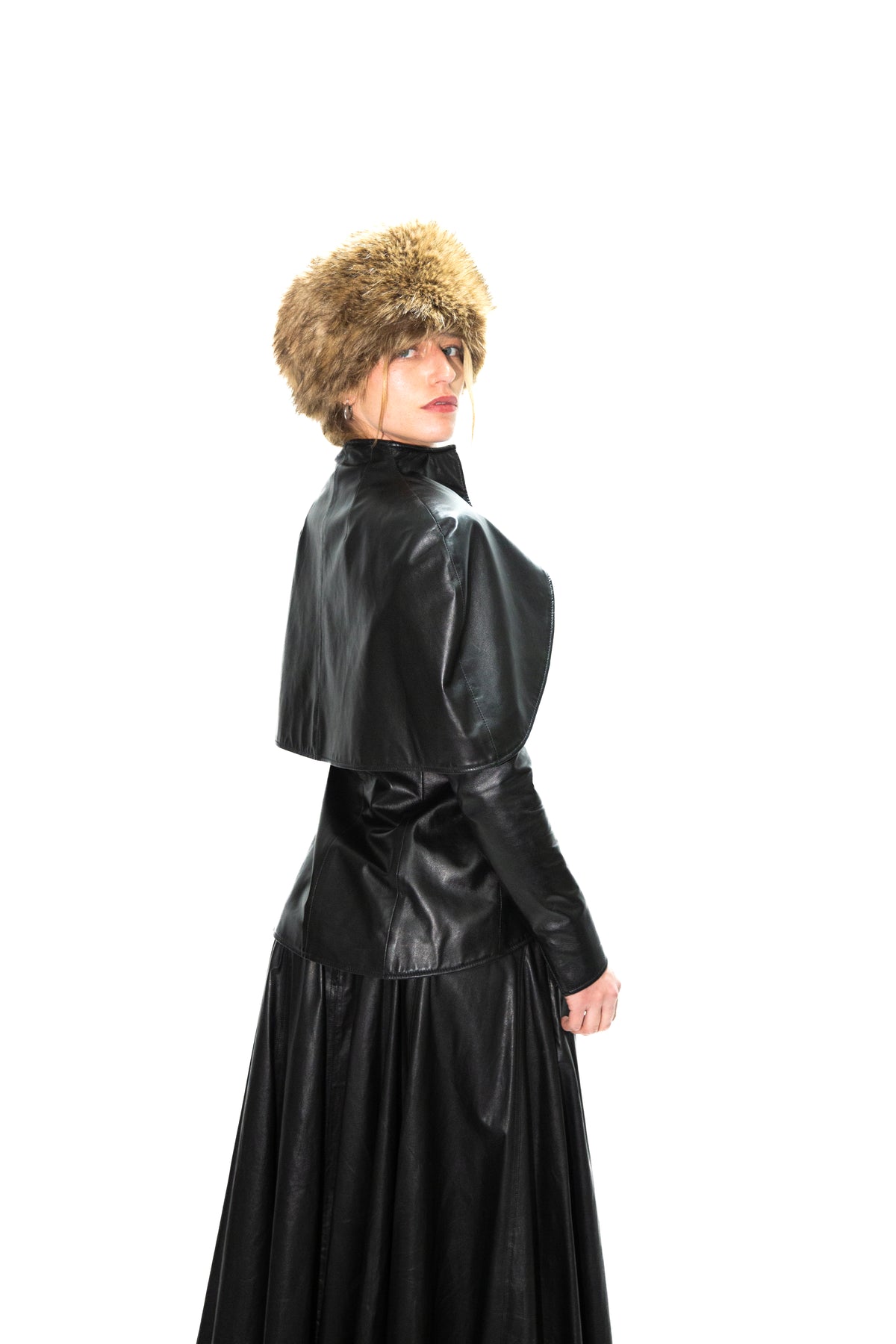 A statement piece featuring a caped shoulder silhouette, Mandarin collar, button front closure, and hidden buttons leading to the neck.