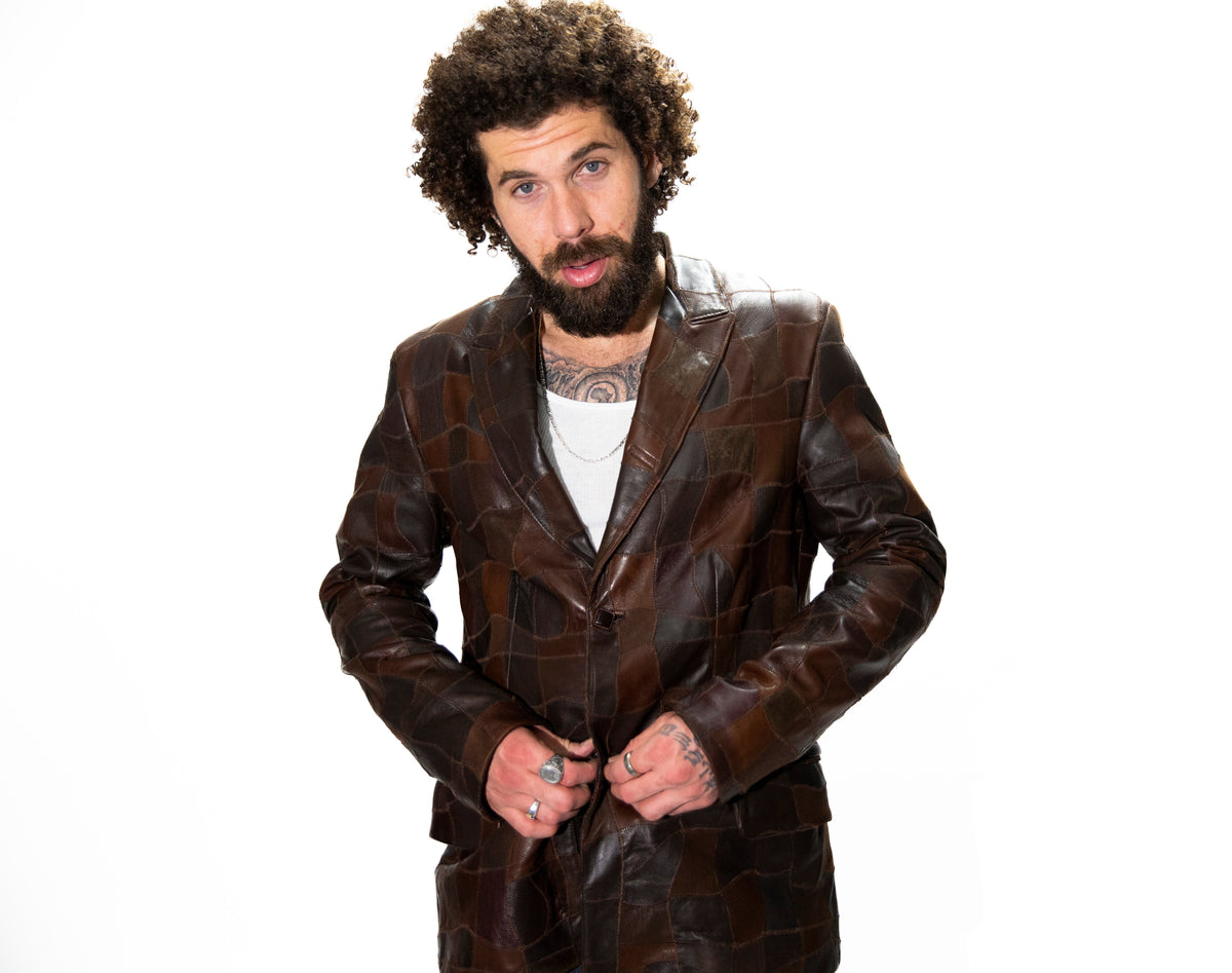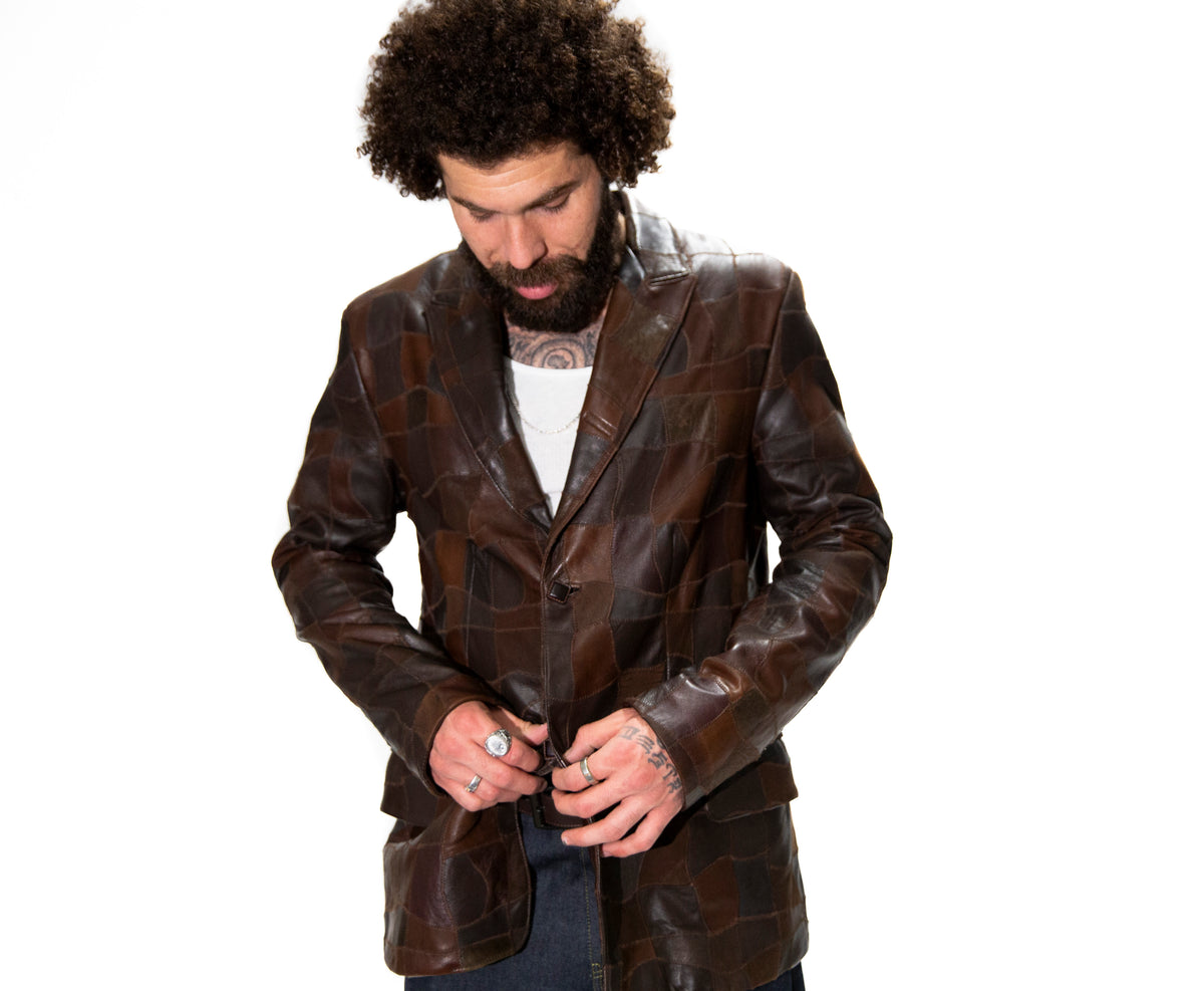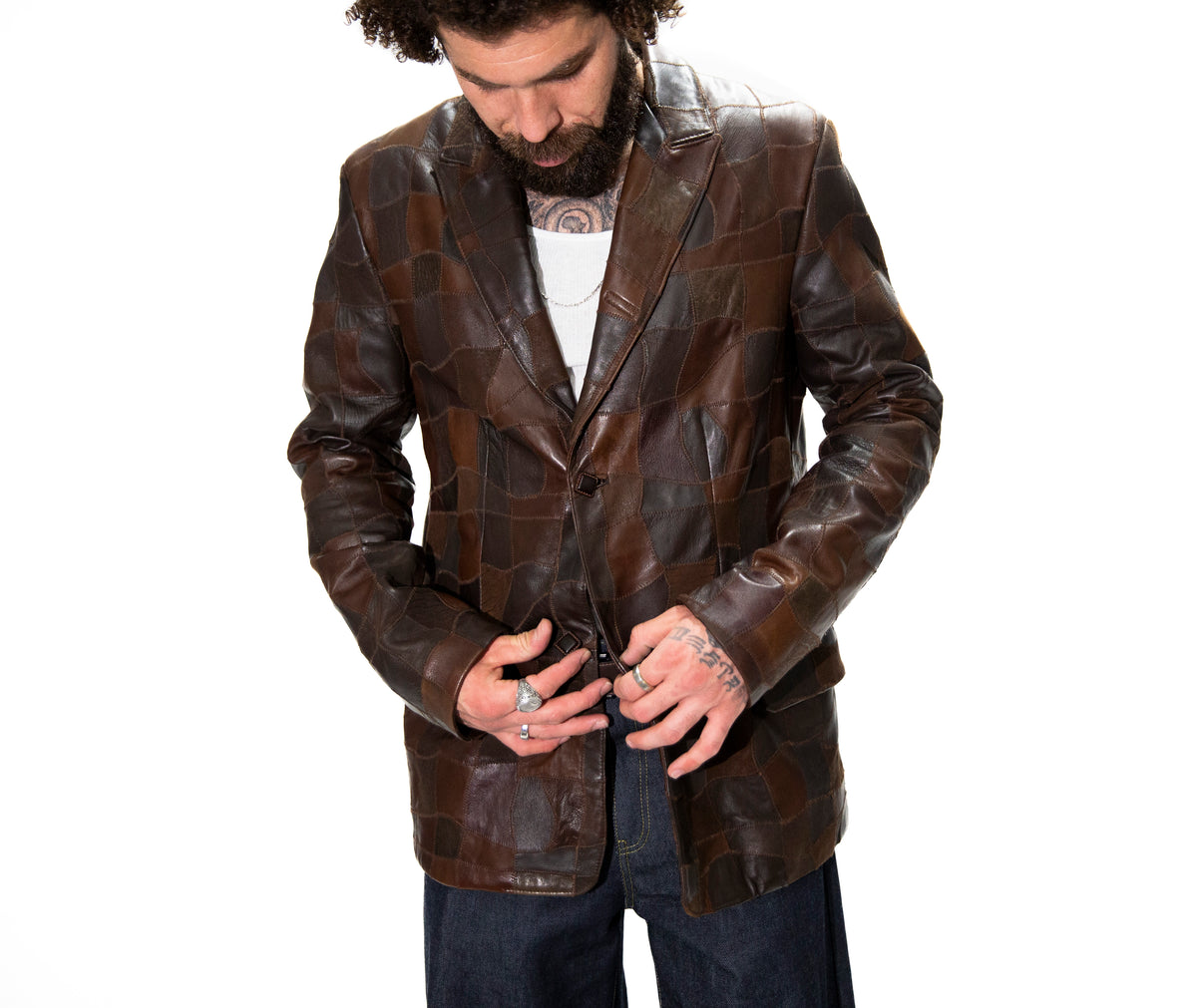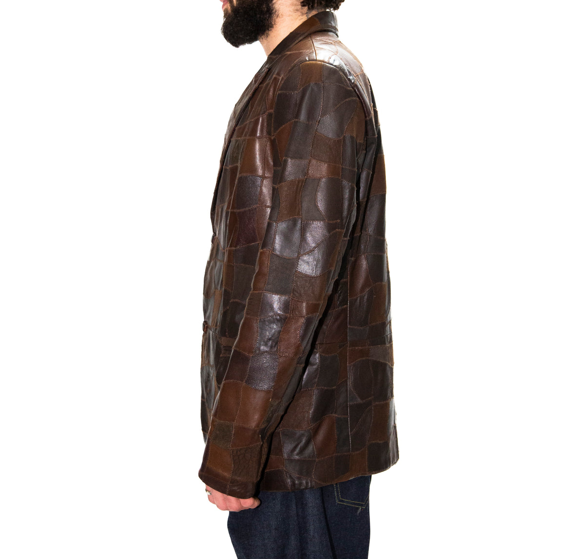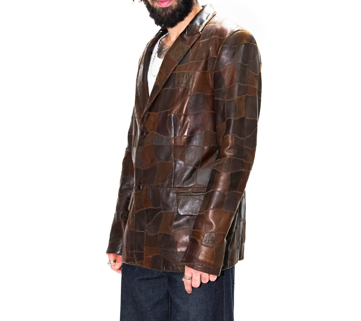 Multi hues of Brown Italian Lamb leather, this uique coat sewn In a classic blazer style in a mosaic pattern.commanding car coat length and Two Side Pockets with pocket flaps.