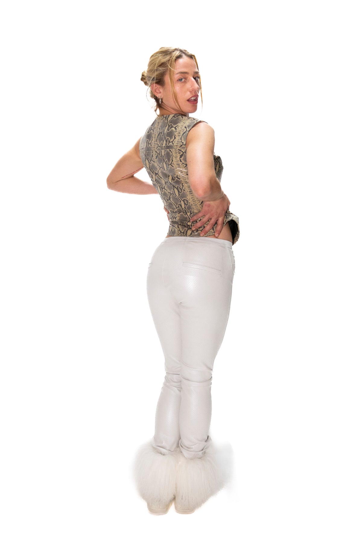 A crew-neck vest crafted from BLACK & TAN SNAKE snake-printed lamb leather, featuring a Riri zipper closure for effortless style. FABRIC 100% Lamb Leather FEATURES Crew neck design Signature snake-print leather Premium Riri zipper