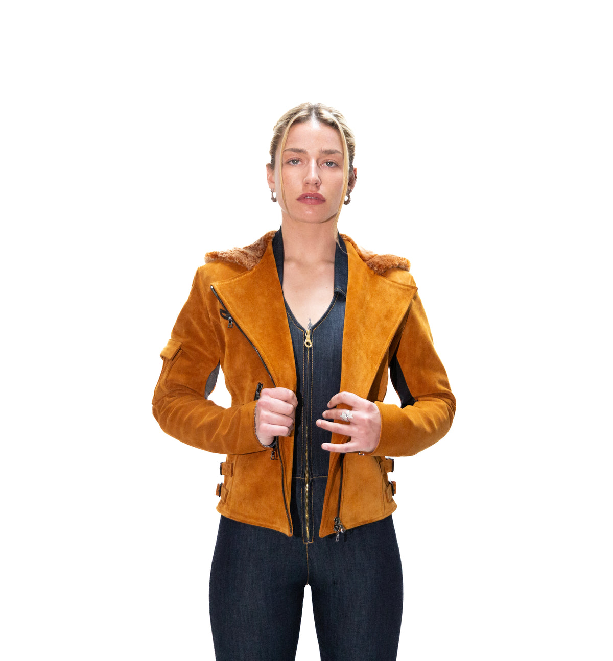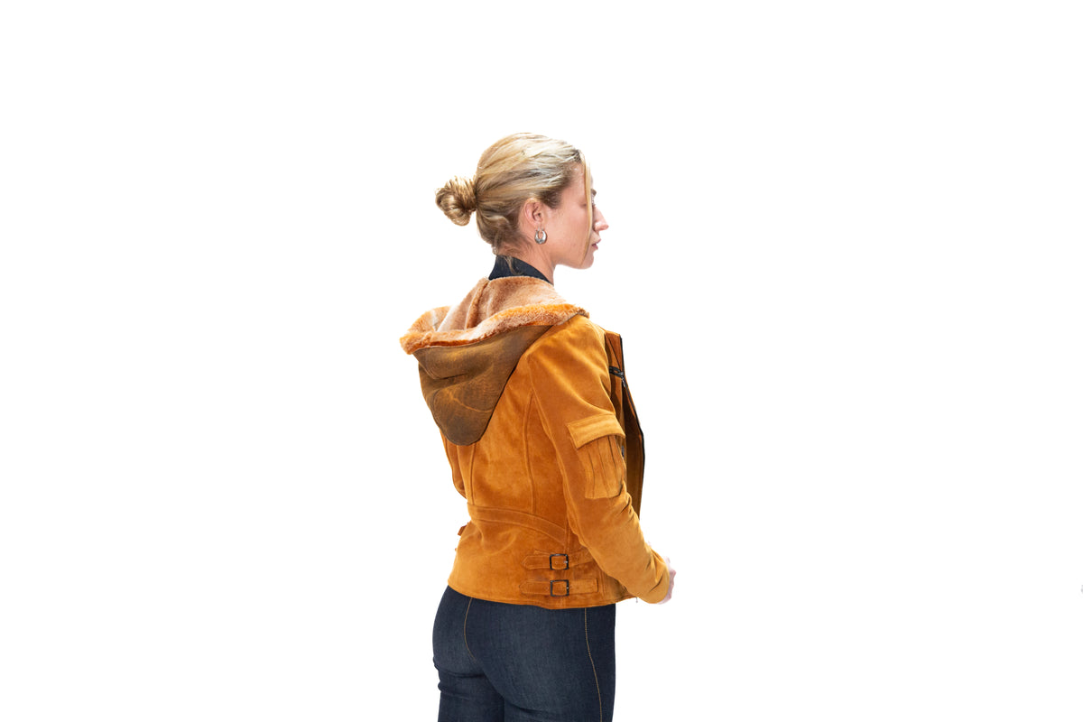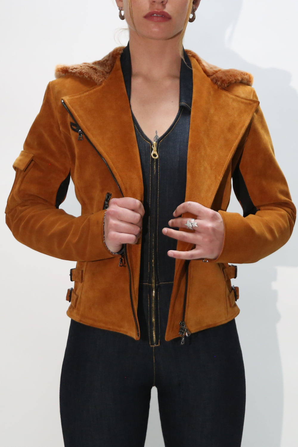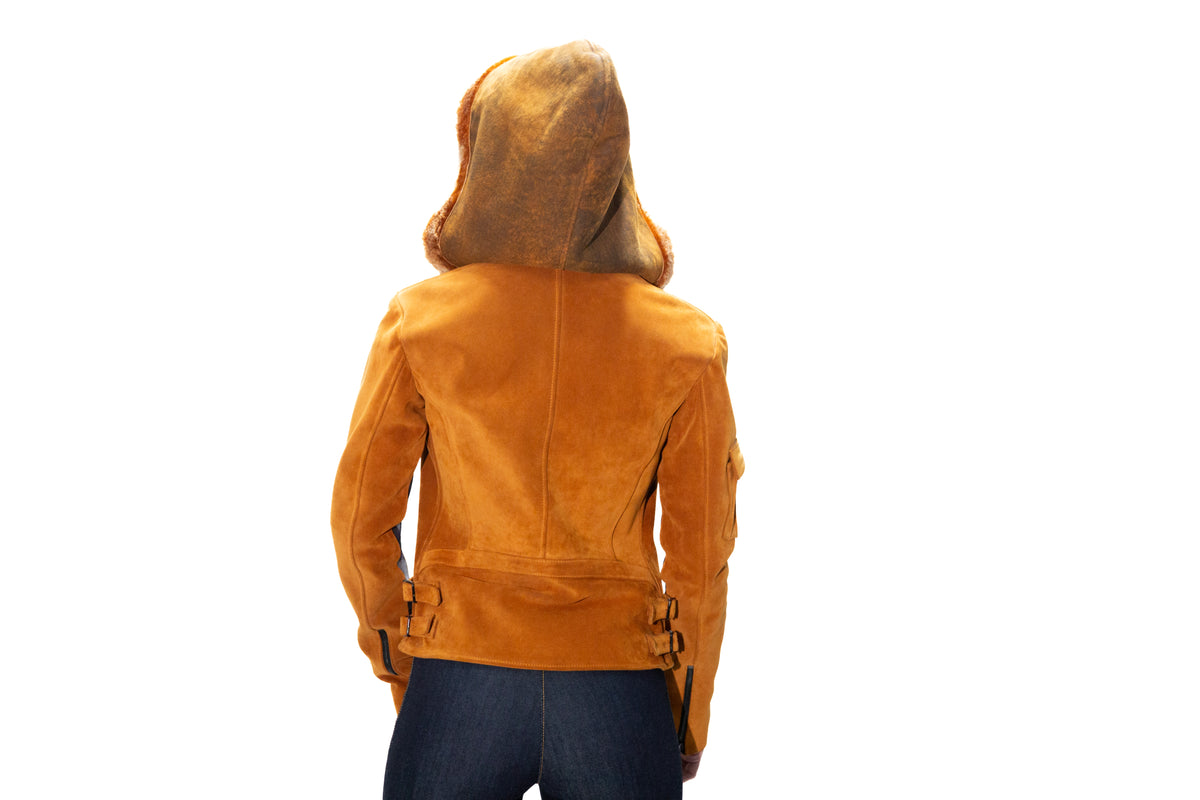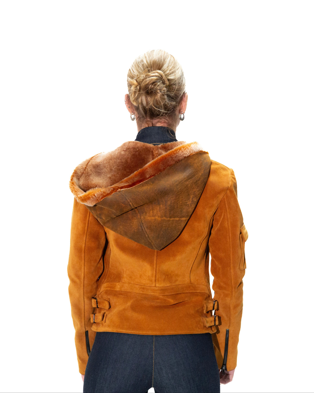 A plush shearling hooded jacket made from soft Italian tobacco calf suede. Fully linned Featuring black zippered pockets and sleeve details with belt buckles at the waist and an asymmetrical front closure.