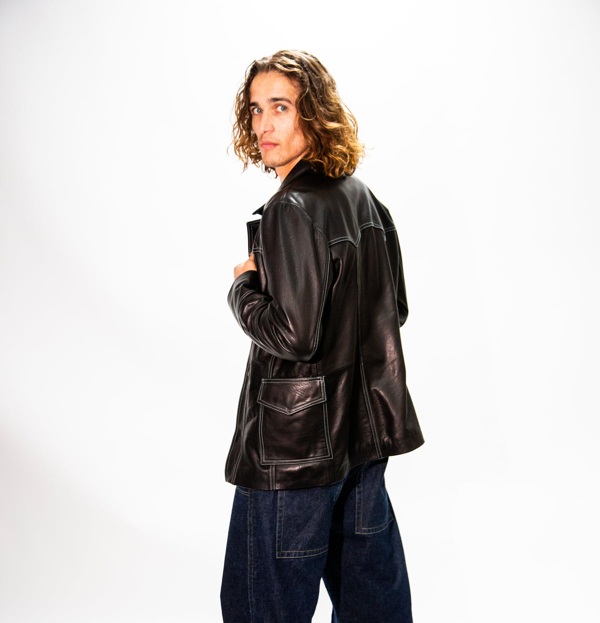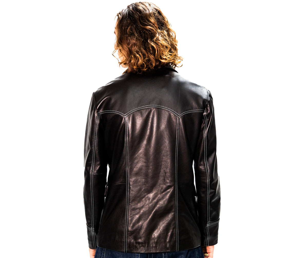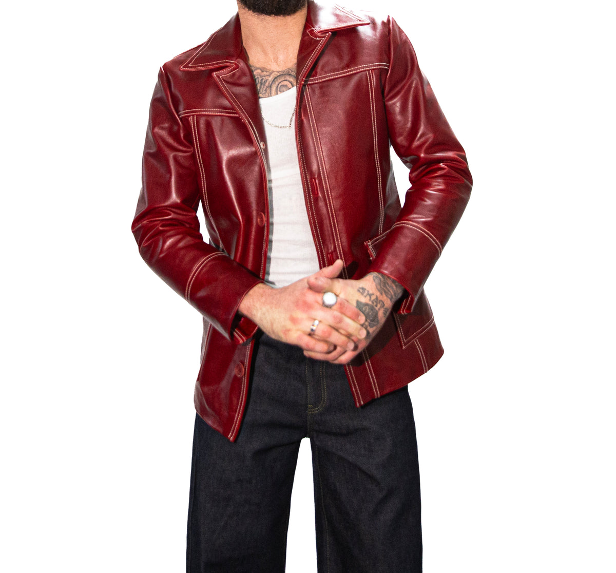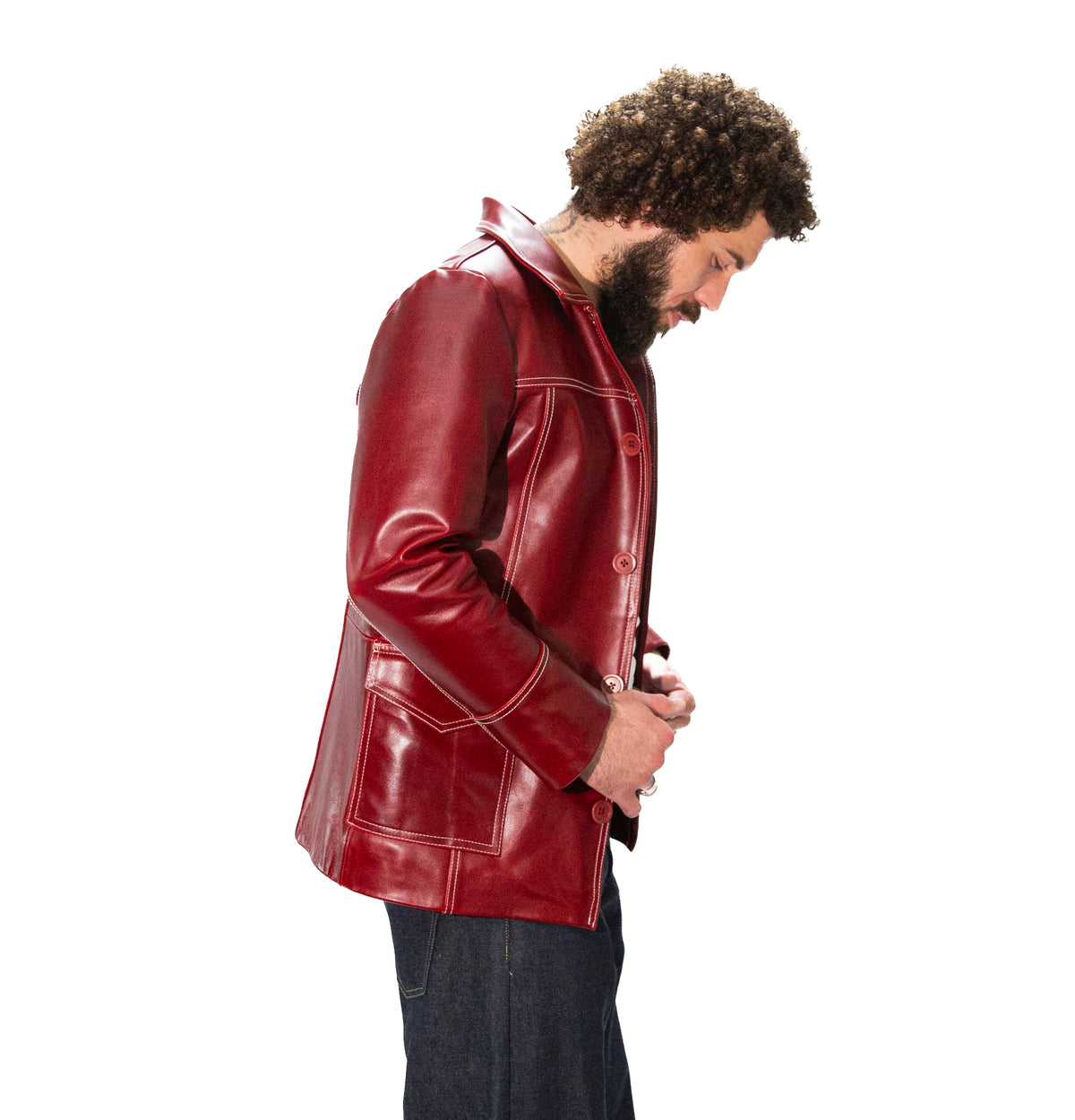 Italian calfskin leather,4 button front,two side pockets, contrast stitch detail, Jacket made from the original pattern.