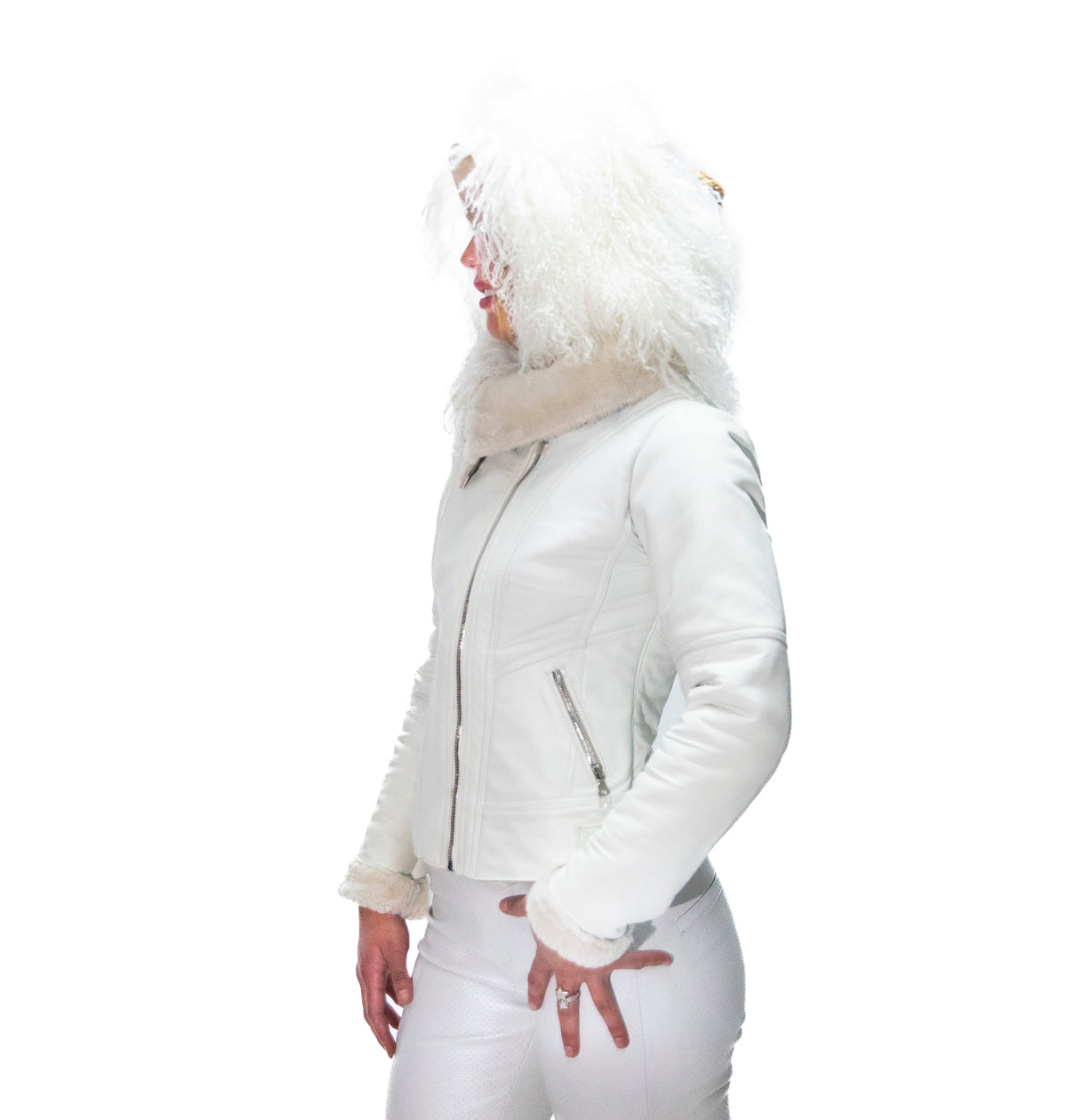 A sleek MOTORCYCLE STYLE SHEARLING jacket in super soft white Italian lamb leather, featuring plush white shearling lining and silver hardware for a modern touch.